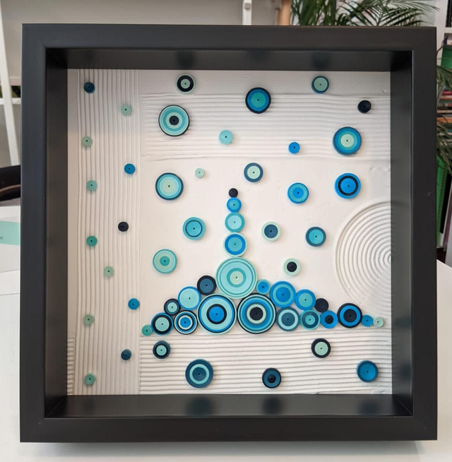 Beautiful quilling composition with modeling paste. The composition is handmade with high-quality paper and is framed in a white wooden frame.
